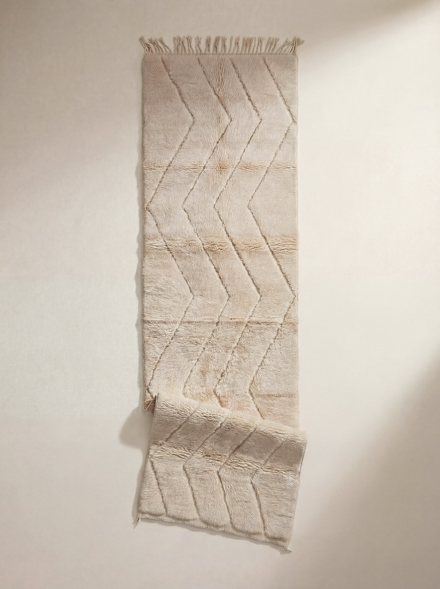 Dette vakre Mrirt-gangteppe i écru er håndknyttet med 100 % naturlig ull, og har et delikat zigzag-mønster som gir en sofistikert og moderne estetikk. Teppets myke og behagelige tekstur skaper en luksuriøs atmosfære i gangen eller ethvert rom som trenger et unikt preg. En perfekt kombinasjon av funksjonalitet og skjønnhet, ideelt for å tilføre varme og stil til hjemmet ditt.