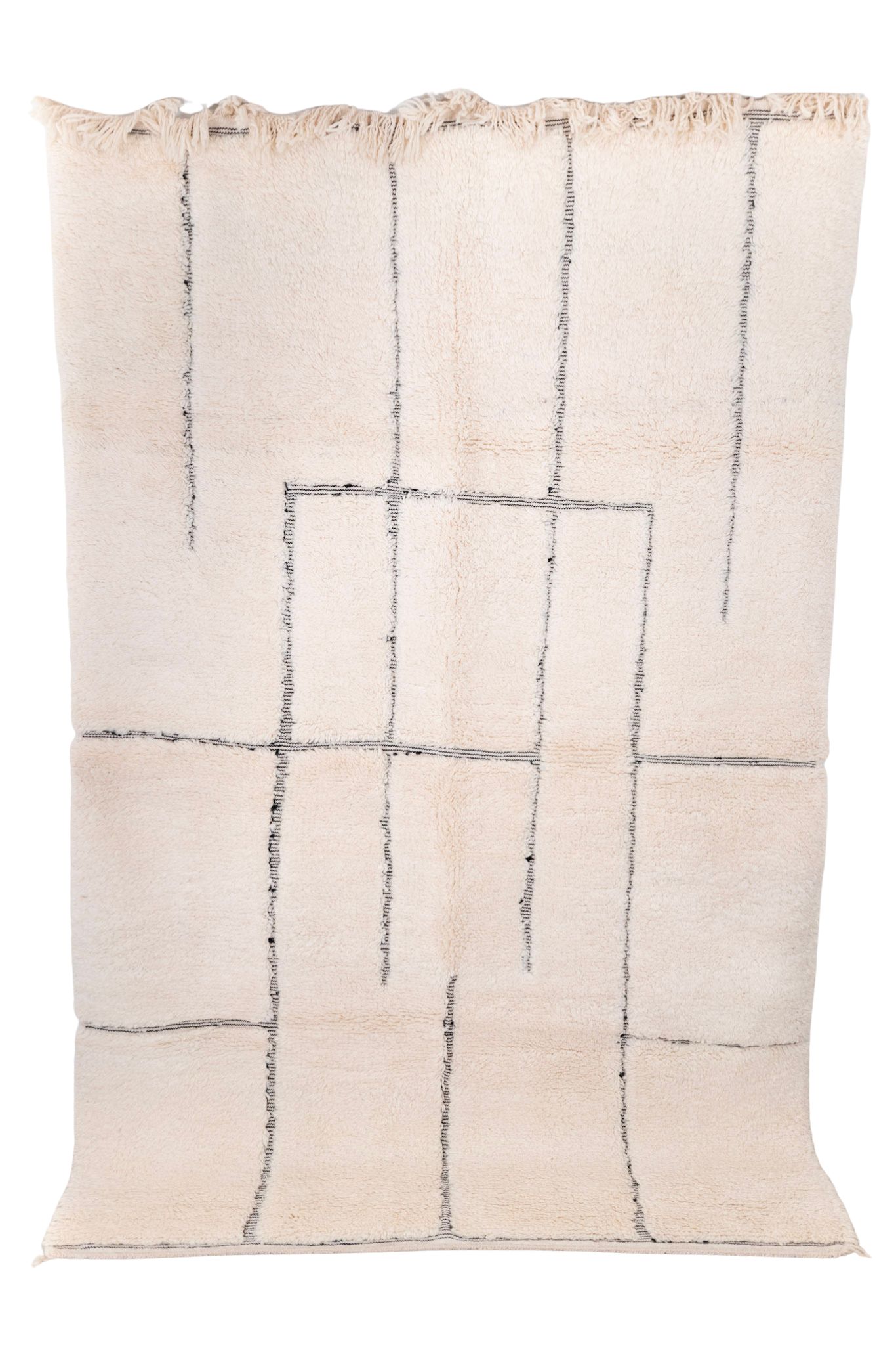 Et håndknyttet Beni Ouarain-teppe i beige, dekorert med svarte broderte striper som danner et intrikat labyrintmønster på tråden.