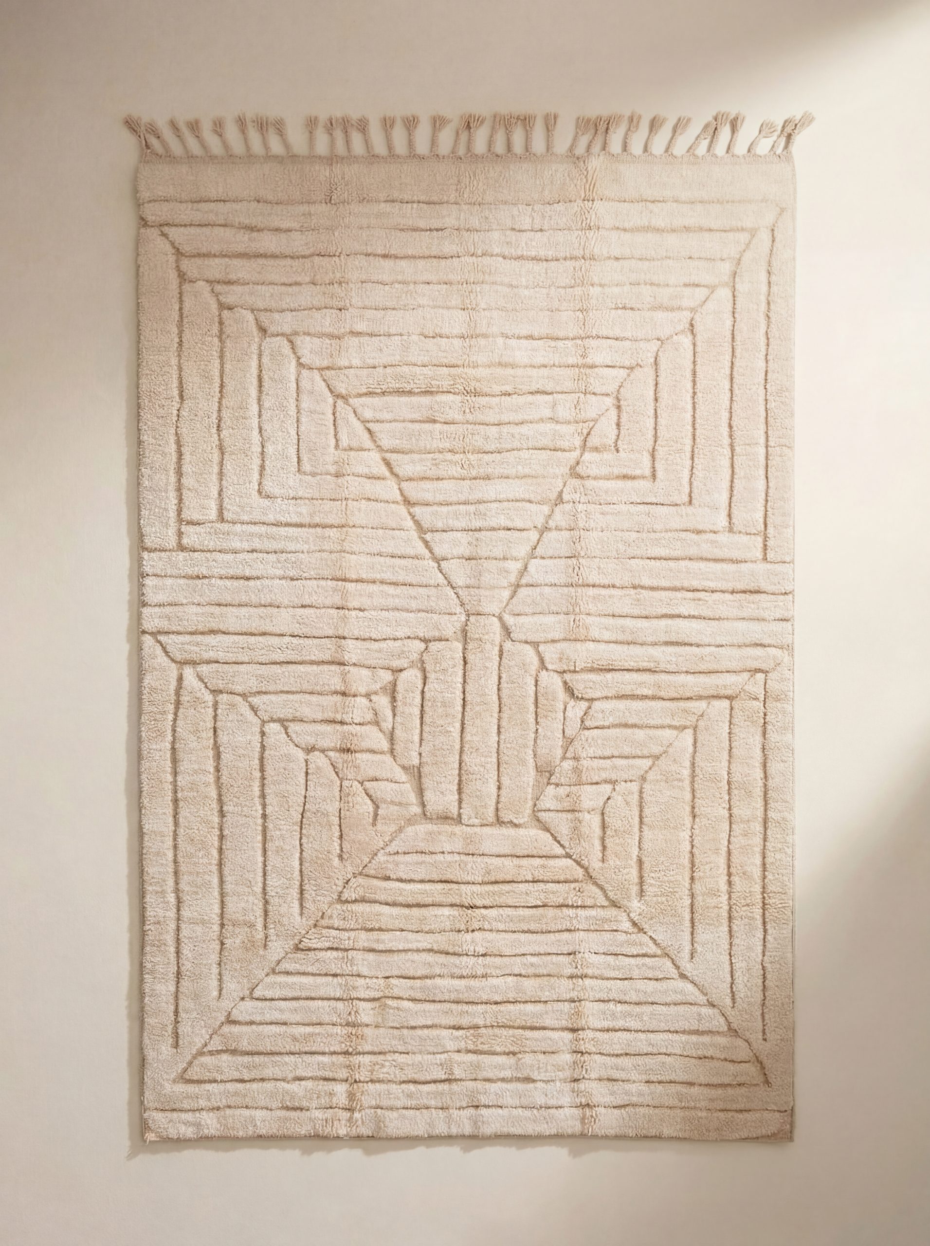 Et håndknyttet Beni Ouarain-teppe i beige, dekorert med subtile beige motiver brodert på tråden. Dette enkle, men elegante designet tilfører teppet en sofistikert tekstur og tidløs skjønnhet, samtidig som det fremhever håndverkets fine detaljer. Den naturlige ullen gir både varme og komfort, og de diskrete broderte motivene gjør dette teppet til et unikt valg for ethvert rom.
