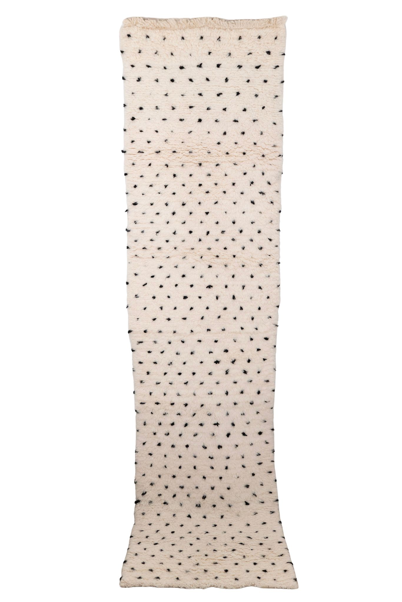 Et håndknyttet Beni Ouarain-teppe med en beige bakgrunn, dekorert med små svarte prikker.