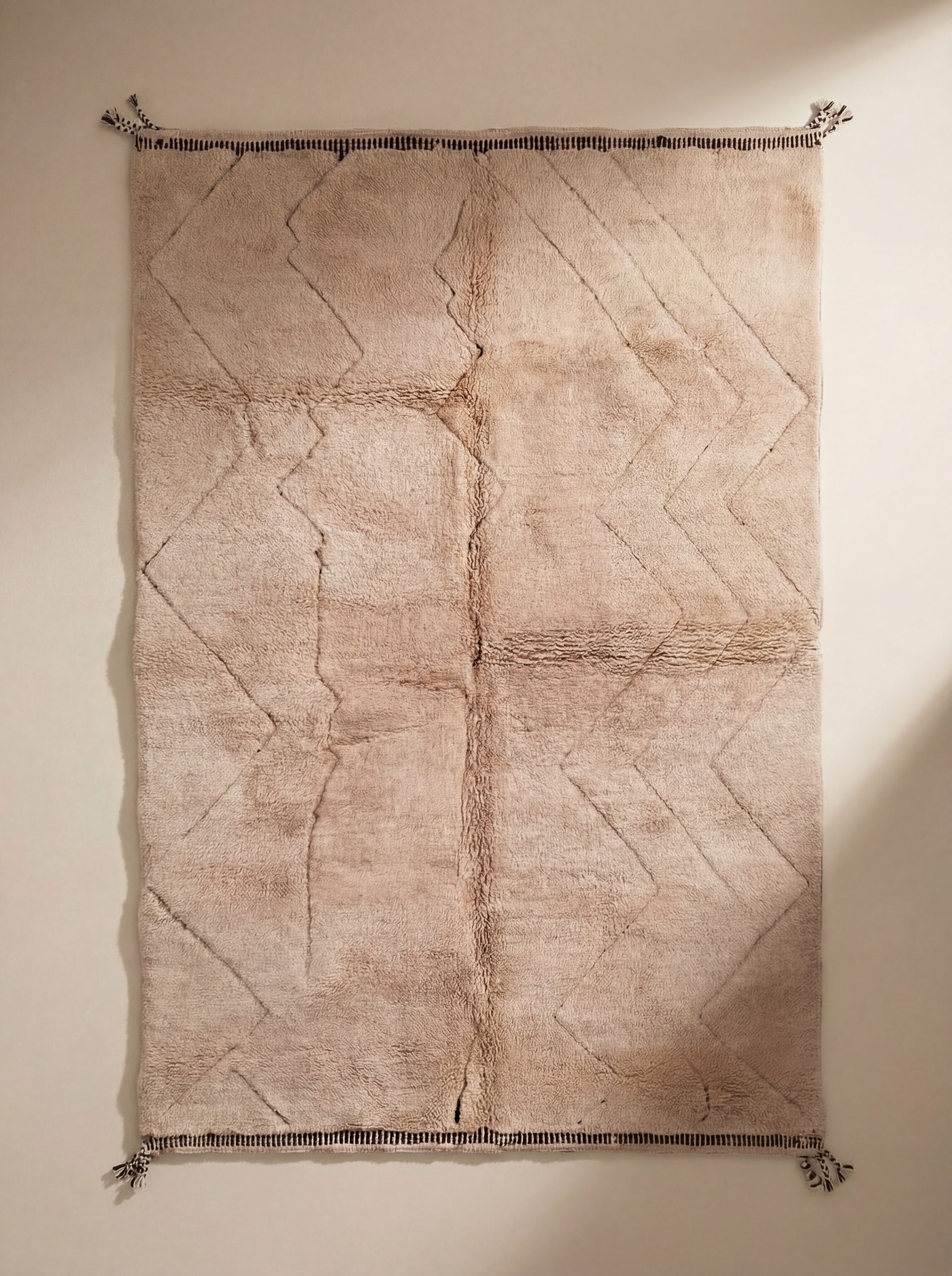 Mønsterene, formet som halve diamanter, tilfører en særpreget og tidløs estetikk som fremhever teppets kvalitet og håndverksmessige preg.